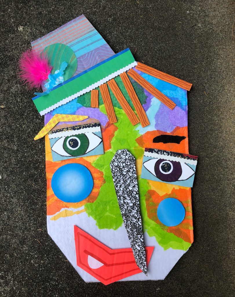 July’s art in the park is by an adult who was looking for something to do at home early-on during the pandemic Stay-At-Home. It’s a cardboard wall mask. If others (kids or adults) would like to make some, they could be put in the kiosk another month. Just cut up a cardboard box for the face and cut separate pieces for eyes, nose, etc. Make it colorful with paint, markers, patterned paper glued on, etc. Check it out in the kiosk in the pocket park on the corner of NE 117th St & 19th Ave NE. P.S. Artist says apologies to anyone afraid of clowns if it resembles a clown; it wasn’t intended to be one.