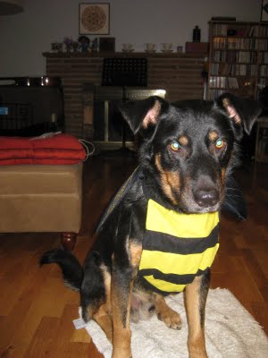 From Erica: I’ve been sick, but managed to rustle up a bee costume for the dog — Charlie’s favorite toy is a squeaky bee!